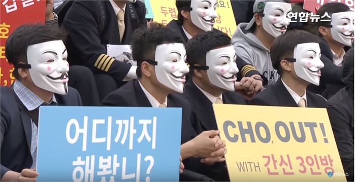 대한항공 직원들이 갑질로 물의를 빚는 조양호 회장 일가의 퇴진을 요구하는 집회를 벌이고 있다. 집회 참가자들은 대부분 신분이 노출될 경우 회사 측의 보복을 우려해 '벤데타 가면'을 쓰고 있다. 출처 : 유튜브(연합뉴스)