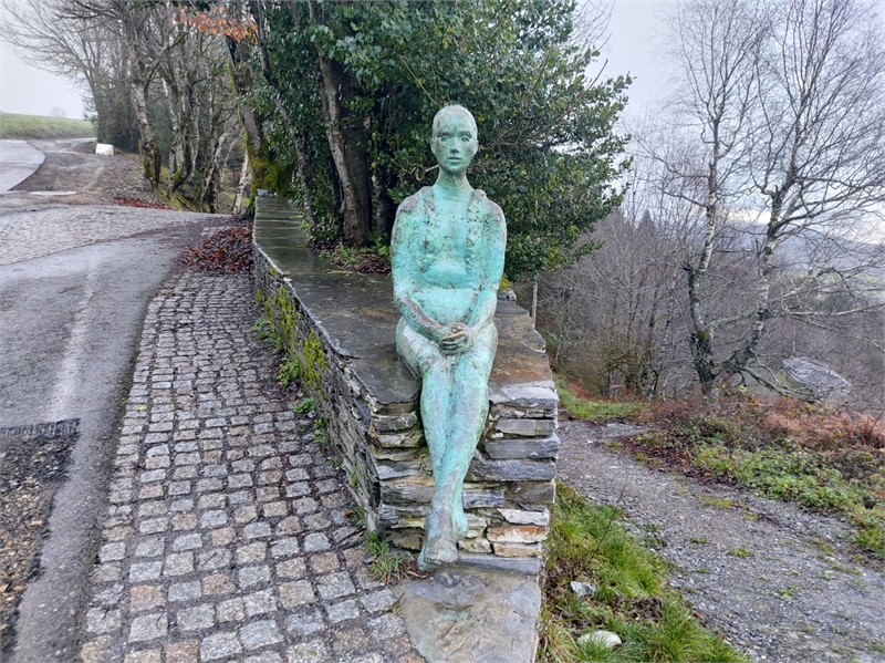 멀리 운무가 가득히 낀 산 풍경은 한 폭의 수묵화 같다. 오전 9시 32분, 산길 오른편에 축사로 추정되는 건물이 하나 있다. 사용을 하지 않는 건물로 보인다. 오전 9시 37분, 길 왼편의 화단에 청동으로 만든 한 여인이 양손을 아래로 다소곳이 모은 채로 앉아 있다.