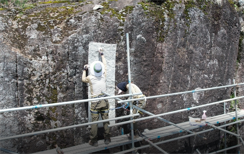 천왕봉 각석을 탁본하고 있는 모습이다. 사진= 지리산국립공원 경남사무소 제공