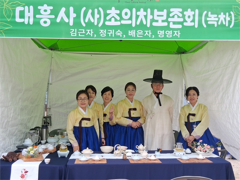 지난 19일 오후 ' 제34회 초의문화제'에 참가한 대흥사 내 '(사)초의차보존회' 회원들과 필자(오른쪽에서 두번째)가 함께 기념촬영을 했다. 사진= 다른 차인