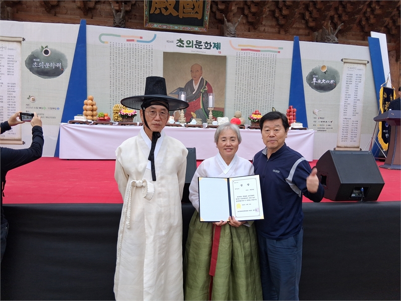 '제34회 초의문화제'의 식전행사 중 하나인 '찻자리 경연대회'에서 필자의 집안 일가인 조병옥(오른쪽 첫번째) 주경숙(가운데) 부부가 특별상을 받고 필자와 기념촬영을 했다. 이날 경연대회에 26개 팀이 참가한 가운데 8개 팀이 수상했다. 사진= 다른 차인