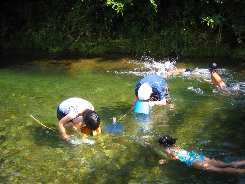 체험 : 물을 만지고 헤엄치고 물에 첨벙 뛰어드는 경험 등을 통해 물온도나 물보라의 움직임, 몸이 떠서 발이 닿지 않을 때의 두려움 등을 배운다.
