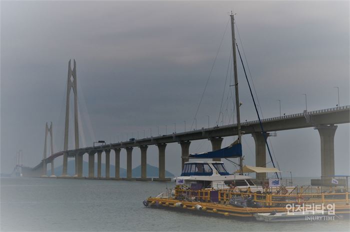 목포를 지나 압해도 섬과 섬 사이로 이어진 천사 대교를 지나간다. 바닷가 천사 대교가 바라보이는 자리에 점심을 먹는다. 참 멀기도 한 곳이다.