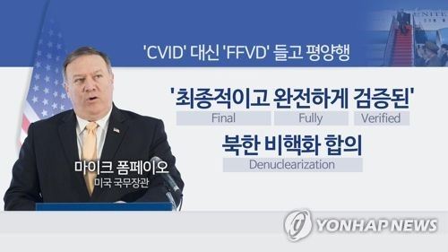 애초 폼페이오 장관은 '완전한 비핵화'라는 용어 속에는 검증가능하고 불가역적이라는 뜻이 내포돼 있다고 설명했다가 FFVD라는 용어를 쓰기 시작했다.