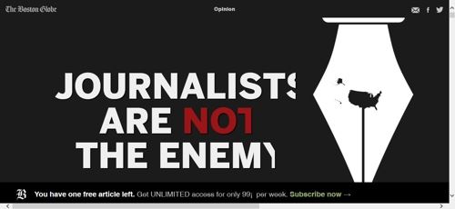 미 전역의 200여개 신문사는 이날 트럼프 대통령의 언론 인식과 반(反)언론 기조에 반대하는 사설을 일제히 게재했다. 트럼프 대통령의 언론에 대한 비판을 '자유 언론에 반대하는 더러운 전쟁'으로 규정하고 신문들의 동참을 촉구한 보스턴글로브를 비롯해 뉴욕타임스 등 50개 주에서 다수의 신문이 동참했다.