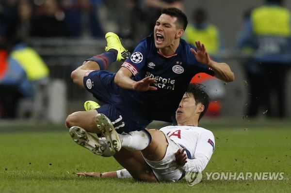 손흥민의 거친 태클(런던 AFP=연합뉴스) 토트넘 홋스퍼의 손흥민(아래)이 6일(현지시간) 영국 런던 웸블리 스타디움에서 열린 2018-2019 유럽축구연맹(UEFA) 챔피언스리그 조별리그 B조 4차전에서 PSV 에인트호번의 이르빙 로사노에게 강한 태클을 하고 있다. jelee@yna.co.kr