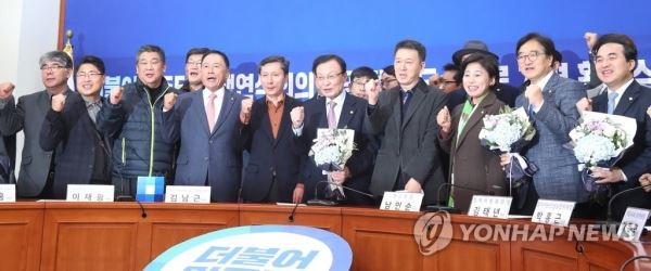 불공정 카드수수료 개편 환영식에서 파이팅하는 이해찬(서울=연합뉴스) 김주환 기자 = 더불어민주당 이해찬 대표(가운데)와 참석자들이 30일 오전 국회에서 열린 민생연석회의, 불공정 카드수수료 개편 환영식에서 파이팅하고 있다. 2018.11.30jujuk@yna.co.kr
