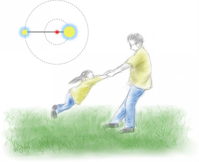 제3의 관찰자 시선에서 둘은 ‘질량중심’ 주변을 각기 다른 반경으로 회전하고 있다. 하지만 상대적 관점에서 아이는 아빠 주변을 돌고 있다.