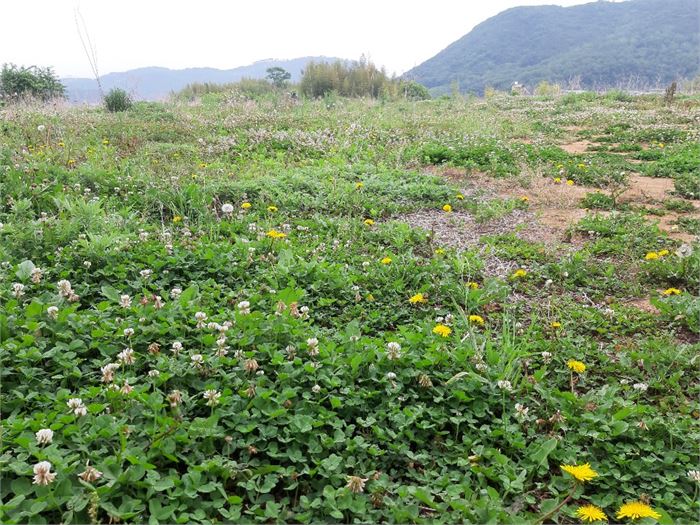 처음 사진은 명촌마을 지방도에서 언양읍에서 상북면으로 접어드는 <부리시봇디미>라는 좁은 골짜기를 향해 찍은 사진입니다. 노란 민들레와 하얀 클로버, 진자주 빛 흑싸리꽃을 바탕으로 그 황폐한 언덕의 뒤쪽으로 작은 대밭과 혼자 선 활엽수 한 그루를 볼 수 있습니다.
