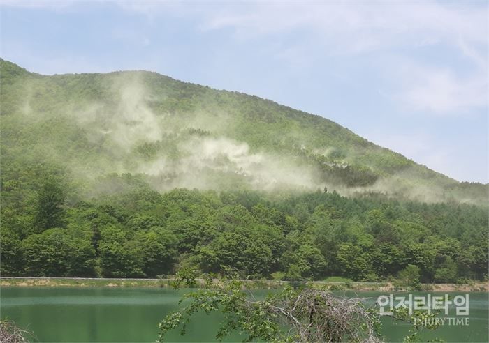 방금 호수 건너 밝얼산 기슭에 웬 노란 구름이 피어오르는 것이었습니다. 산불인가 싶어 깜짝 놀랐지만 불꽃이 피어오르지 않아 안심을 하고 혹시 황사가 심해 그런지 살펴보아도 한 곳에서만 집중으로 피어올라 바람을 타고 흐르는 것이 그것도 아니었습니다.