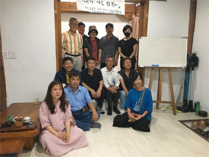 특강 후 몇 사람이 조용헌 교수와 기념촬영을 하고 있다. 가운데 앉은 사람 중 왼쪽에서 두 번째가 조 교수. [목압서사 제공]
