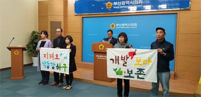 대저대교 건설 방안을 놓고 부산시와 환경단체, 낙동강유역환경청의 입장이 엇갈린 가운데 부산시가 오는 25일 '대저대교 건설 대시민 공청회'를 개최한다. 사진은 지난해 11월 대저대교 최적노선 추진 범시민운동본부의 부산시의회 기자회견 [범시민운동본부 제공]