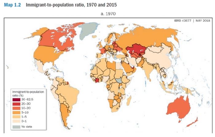 지도 1.2는 1970년(패널 a)과 2015년(패널 b) 국가별 이민자 대 총인구 비율을 보여준다. 이 기간 동안 일부 국가에서는 감소, 다른 국가에서는 상당한 증가 등 이민자 인구 비율의 분명한 변화가 있었다. 놀랍게도, 소수의 국가들은 2015년 지도에서 현저하게 어두워졌다. GCC 국가들이 1970년부터 2015년까지 지역 이주를 위한 중심지로 부상한 것은 이전 섹션에서 언급했듯이 분명하다. 게다가 호주, 캐나다, 뉴질랜드에서는 이민자들 비중은 20퍼센트 이상을 차지한다. 서유럽과 미국의 대부분 지역에서, 비율은 10퍼센트 이상이다. 하지만, 대부분의 국가에서 이민자 대 인구 비율은 이보다 현저히 낮다.
