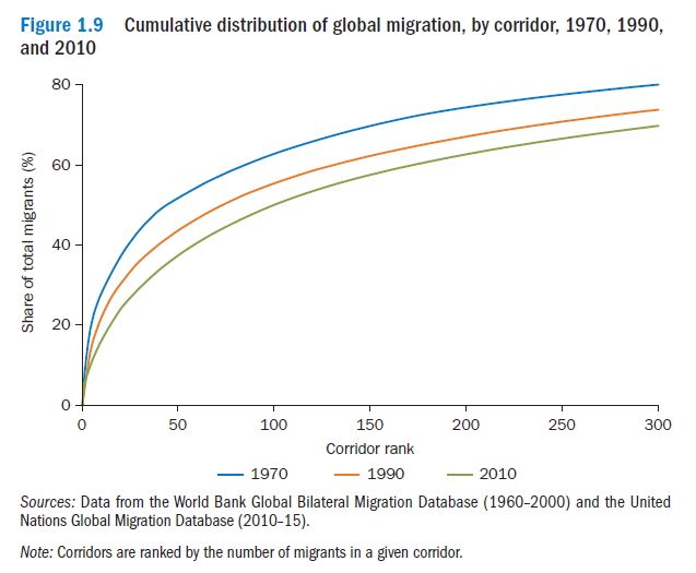 Like figure 1.7, figure 1.9 also depicts the cumulative share of global igration, but now by individual corridors. The corridors are ranked according to their size, so we can identify the share of global migration in the top 10 (or 20 or 100) corridors. The graph indicates that the top 50 corridors accounted for 40 percent of global migration in 2010. Chapter 2 of this report discusses in detail the reason why particular migration corridors exist with such highly concentrated migration flows. Over time, however, the concentration curve gradually shifts down, indicating that the importance of individual corridors has somewhat diminished as migration has become more dispersed. For example, although the top 300 corridors accounted for 84 percent of global migration in 1970, they accounted for 73 percent in 2010.