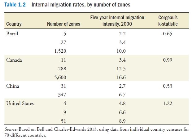 표 1.2는 브라질, 캐나다, 중국 및 미국의 경우 5년 내 내부 이주율을 여러 지리적 분할을 사용하여 지난 5년 내 다른 지역으로 이주한 인구의 비율로 측정한 것이다. 이주율을 비교하는 것은 어려울 수 있다. 다행히도, 우리의 예에서, 각 나라는 비슷한 땅덩어리를 가지고 있지만, 중국은 캐나다보다 거의 40배 더 인구밀도가 높고, 그 사이에 다른 나라들이 있다. 국가 간 이주율을 일관되게 만들기 위한 한 가지 시도는 Corgeau’s k의 k-통계(Corgeau 1973)이다. 이 통계는 측정된 이주 성향이 구역의 수에 따라 다르다는 생각에 의존한다. 구체적으로, 한 국가에서 더 많은 구역이 있을수록 더 많은 이주가 기록될 것이다. Corgeau의 k-통계학은 동일한 국가의 분할 수준에 따라 이동 강도의 변동을 측정하여 이를 조정하려고 한다. 이 k-통계량은 미국이 가장 많은 내부 이주를 경험하고, 그 다음이 캐나다임을 시사한다. 브라질의 국내 이주율은 미국의 절반 정도이며, 중국에서는 여전히 낮다.