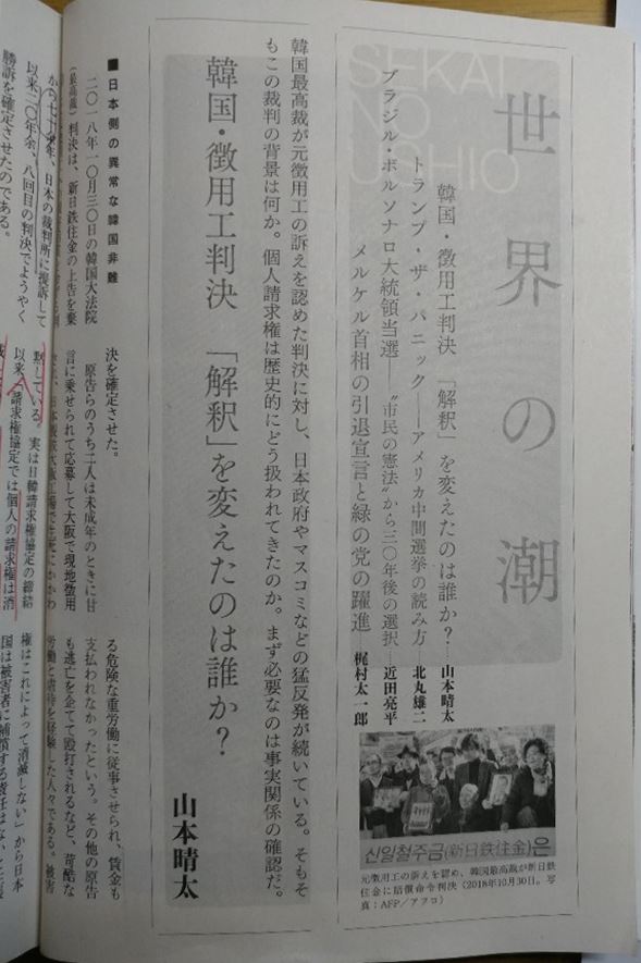 진보 성향의 일본 시사월간지 '세계'의 강제징용 배상 판결 관련 기사.