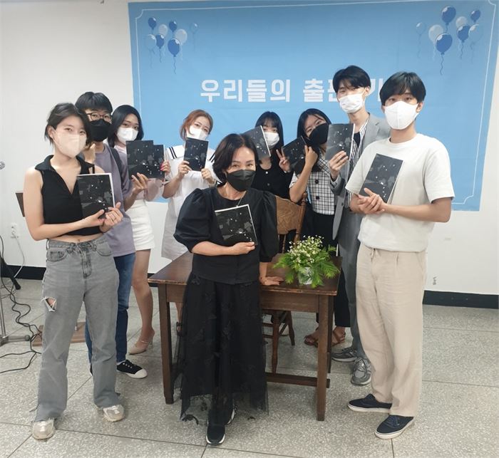 e시집 《길잃은 양들의 모험》을 출간한 한국장학재단 학생들과 멘토 손현숙 시인(앞줄 가운데), 손 시인부터 시계방향으로 박상아 이현창 인예린 도수연 김혜원 김민아 석정무 윤석현