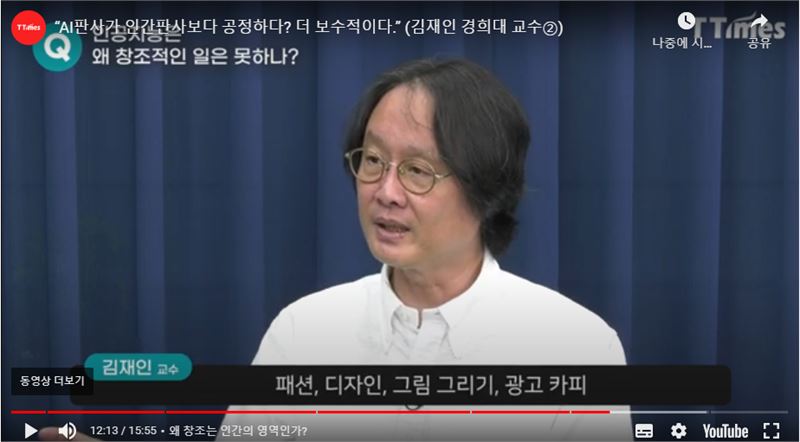 티타임즈와 인터뷰를 갖는 철학자 김재인(경희대) 교수. 김 교수는 "인공지능은 최종결정권자가 될 수 없으며, 창작은 인간으이 몫"이라고 강조했다. [티타임즈 유튜브 캡처]