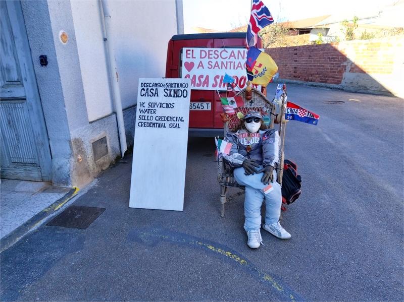 낮 12시 32분, ‘빌라레스 데 오르비고’(Villares De Orbigo) 마을이다. 입구에 마을 입간판이 서 있다. 몇 집 안 되는 전형적인 시골 마을이다. 그런데 마을 안으로 5분가량 걸어가니 길에 재미있는 풍광이 있다. 사람 크기의 인형에 옷을 입혀 모자를 씌우고 신발을 신겨 의자에 앉혀 놓았다. 자세히 보지 않으면 여성이 앉아 있는 것 같은 착각을 불러일으킨다. 인형의 주인아저씨가 바로 옆 창고에서 순례자들을 대상으로 이것저것 물건을 팔고 있다. 낮 12시 43분, 그 마을의 마지막 집을 지나 또 순례길로 접어들었다. 흙길이 두 갈래인데 도로 바닥에 노란 화살표로 표시가 돼 있다.
