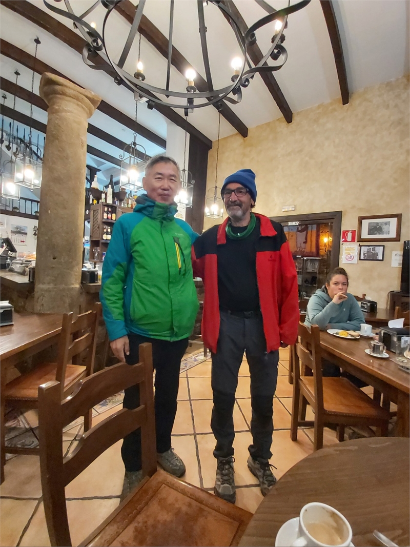 어제 같은 방에서 잤던 스페인 바르셀로나 남자(오른쪽)와 마을 카페에서 함께 사진을 찍었다. 그는 산티아고 순례길을 여덟 번째 걷는다고 했다. 사진= 다른 순례자