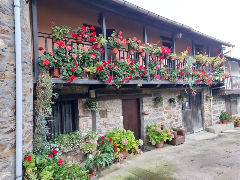 ‘리에고 데 암브로스’ 마을 초입에 산티아고까지 223.6km 남았다는 표지석이 있다. 비가 쫙 퍼붓다가 금방 그쳤다. 마을의 집들이 비를 쫄딱 맞아 젖어 있고 길에도 빗물이 고여 있다. 이 마을 역시 산골 마을이다. 그런데 한 집을 정비를 해놓고 순례객들을 위해 2층 베란다에 꽃이 핀 화분을 많이 매달아 놓았다. 바닥에도 꽃 핀 화분이 여러 개 있다. 밝은 꽃들을 보니 마음이 환해진다. 사람이 살고 있는 것 같지는 않다.