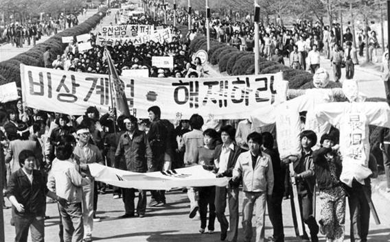 1980년 ‘5월의 봄’은 유신체제를 계속 이어가려는 신군부 세력과 민주 회복을 바라는 국민의 격돌이었다. “비상계엄 해제하라”는 펼침막을 들고 시위 중인 대학생들(경향신문사, 1980년 5월15일).