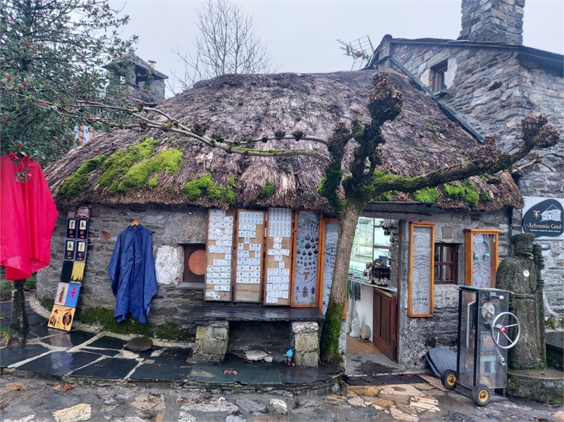 청동상(靑銅像)에서 1분가량 가니 오른편 마을로 접어든다. 집은 몇 채밖에 없다. 신자가 없어 사용을 하지 않는 듯한 자그마한 교회가 있다. 그 앞에 우리나라의 옛 초가집과 닮은 집이 있다. 지붕을 억새로 이어 만든 집이다. 우리나라의 옛 선비들은 이런 집을 한시(漢詩) 등에서 모옥(茅屋)이라고 표현했다. 이 모옥 앞에 돌로 깎아 만든 순례자 형상이 있다. 모옥을 구경한 후 그 옆에 있는 카페에 들어갔다. 오전 9시 40분이다. 다른 손님들이 커피를 마시며 이야기를 나누고 있다. 필자는 메뉴판에 차(茶)가 있어 차를 주문해 마셨다. 카페 건물도 오래된 작은 돌집이다. 카페가 마음에 들었다.