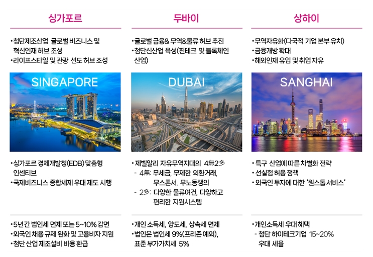 두바이는 글로벌 기업 유치 및 글로벌 기업에 우수인재 공급을 위해 Knowledge Village(지식촌), 아카데믹 시티 운영 등으로 글로벌 명문대학을 유치하고 있다. 로테르담 역시 외국인 취업 및 정주환경 조건 등으로 글로벌 기업이 집적되고 글로벌 인재가 모이는 선순환 효과를 가져오고 있다.