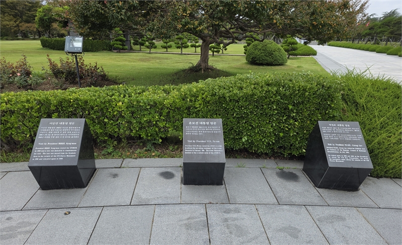 이명박·박근혜·윤석열의 유엔기념공원 방문 기념비(방문석)가 공원 내 ‘유엔군 위령탑’ 앞 공간에 일렬로 놓여 있다. [사진 = 박철]