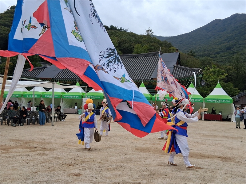 지난 19일 오후 2시부터 대흥사 대웅보전 앞 마당에서 '제34회 초의문화제' 본행사 전에 '찻자리 경연대회'가 열리고 있는 가운데 풍물굿패 '해원'이 흥을 돋우고 있다. 사진= 조해훈