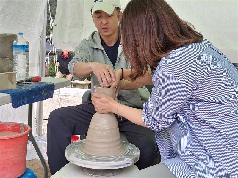 '제34회 초의문화제'의 특별행사 중 하나인 '찻잔 만들기 체험'에서 한 여성 참여자가 물레를 돌리며 찻잔을 만들고 있다. 사진= 조해훈