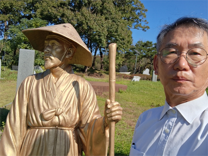 '삿갓 문학동산'에 세워져 있는 김삿갓 동상 앞에서 필자가 셀카로 촬영했다.
