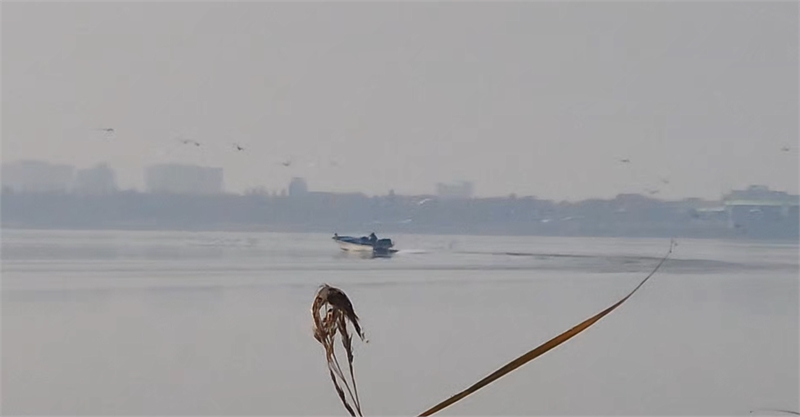 25일 오전 10시6분께 어선으로 보이는 한 선박이 강서낙동강교 방향에서 낙동강하구 문화재보호구역 내 대저대교 건설예정지 부근에서 휴식 중이던 큰고니 무리를 향해 돌진하고 있다. 그러자 큰고니들이 황급히 날아오르고 있다. [사진 = 습지와새들의친구 제공]