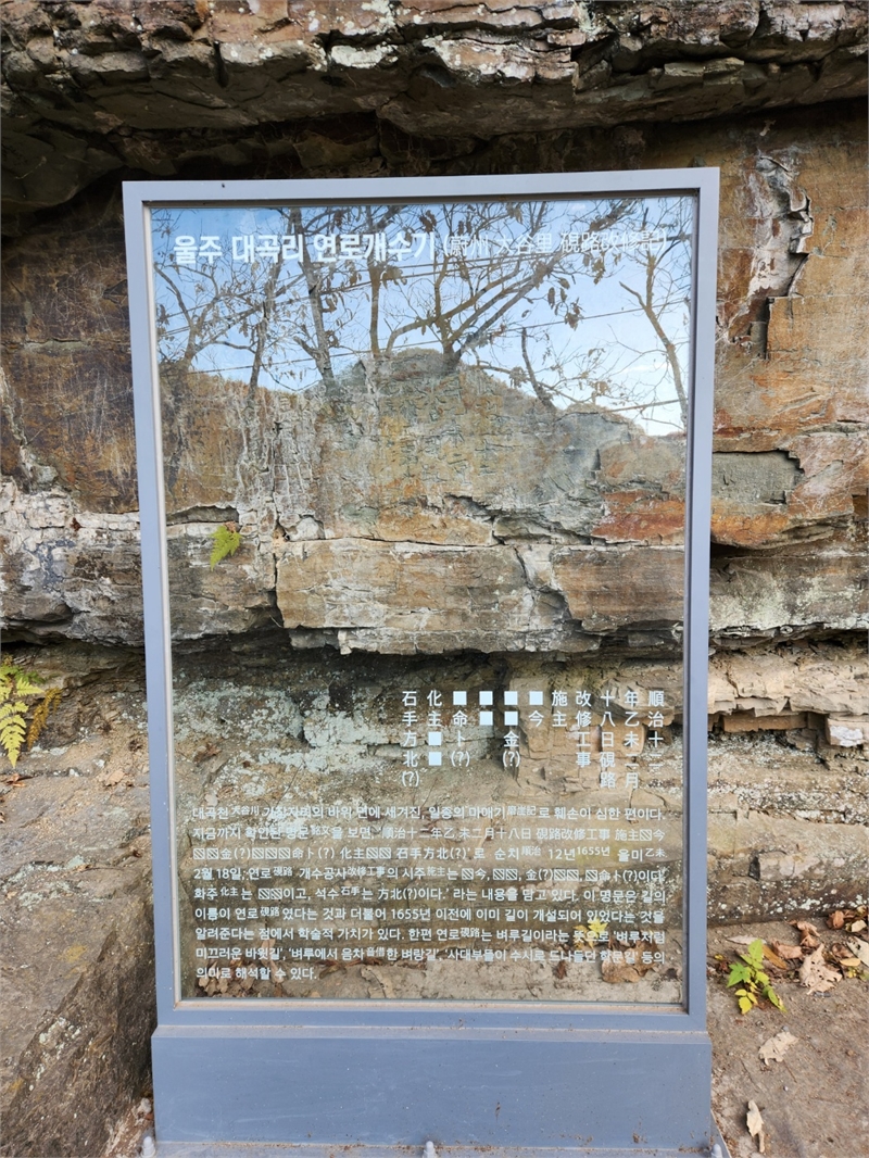 집청정에서 주인장과 한참 이야기를 나누며 다리품을 쉬었다가 반구대 암각화(국보 제285호)를 만나러 간다. 1km 남짓 흙길은 고즈넉하기 이를 데 없다. 가는 길 왼쪽 암면(巖面)에 써진 ‘대곡리 연로개수기’라는 명문에 눈길이 간다. 1655년 2월 18일에 이루어진 연로(硯路, 벼룻길) 공사의 시주·화주·석수의 이름을 새겨놓았는데, 1655년 이전에 이미 이 길이 개설되었음을 입증한다. 반구천 일대는 최고급 벼룻돌 산지로 명성이 자자하다.